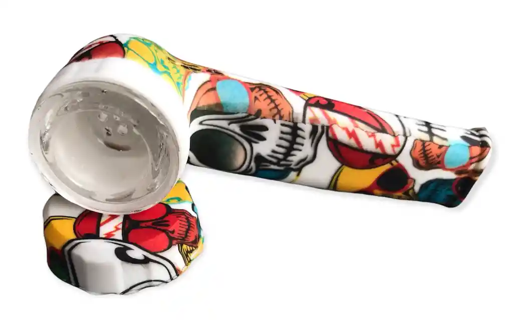 Pipa de silicona con tapa, quemador de pyrex Diseño Blanca Calavera multicolor Modelo único por unidad