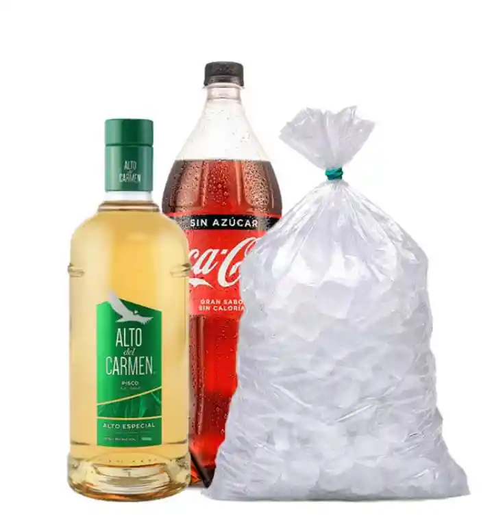Pisco Alto del Camen 750 cc + Coca-Cola Zero 2L+ Hielo 1 kg