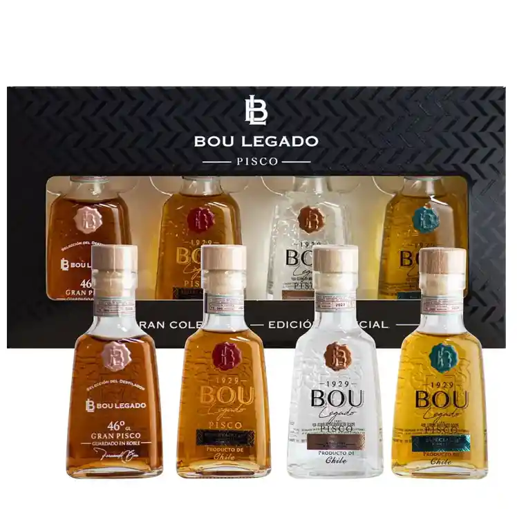 El Pack de 4 Miniaturas de Pisco Bou Legado reúne en formato exclusivo las mejores expresiones de esta reconocida casa pisquera chilena. Cada miniatura es una réplica exacta en vidrio de su icónica botella de 750ml, elaborada artesanalmente y presentada en un estuche de lujo especialmente diseñado para distinguir cada variedad. Esta edición especial incluye: 1 Miniatura de Pisco Bou Legado Roble 35º – 50ml de suavidad y elegancia. 1 Miniatura de Pisco Bou Legado Blanco 40º – Ganador de Medalla de Oro en Catad'Or World Spirits Awards 2022. 1 Miniatura de Pisco Bou Legado Roble 40º – Ganador de Medalla de Oro y Mejor Pisco del Mundo 2025. 1 Miniatura de Gran Pisco 46º Bou Legado Selección del Destilador – Fuerza, pureza y autenticidad en cada gota.