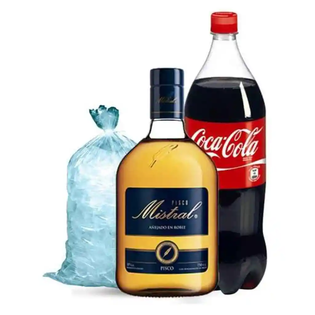 Pisco Mistral 1L + Coca-cola 1.5L+ hielo 1kg
