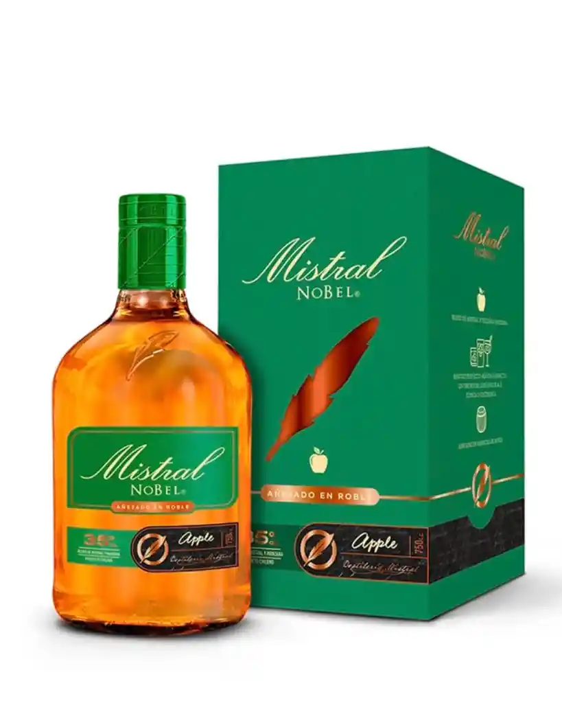 Pisco Mistral Nobel Apple 750cc una innovadora fusión que combina la suavidad del pisco Mistral con el sabor fresco y frutal de la manzana verde, logrando un destilado aromático, ligero y perfecto para cócteles o disfrutar solo con hielo.