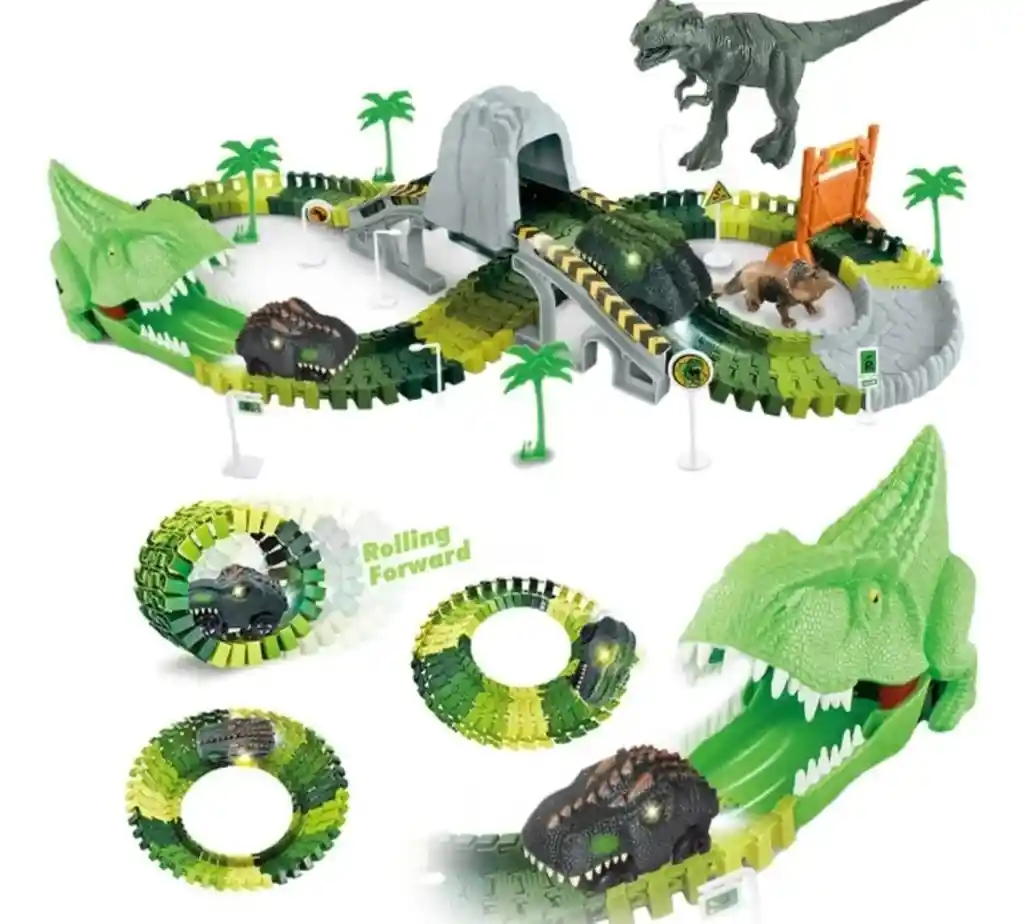 Pista de Dinosaurio con Auto Dinosaurio con luces Led Puedes armar esta pista de la manera que quieras , hacer pequeños circuitos o realizar la grande total, todo al estilo de dinosaurios. Edad recomendada 3 años Fuente de energía pilas 2 AA (no incluidas) Beneficios de uso el mundo de las pistas de autos son una gran alternativa para regalar a los pequeños para que jueguen independiente o bien con amigos donde compiten por el objetivo de llegar a la meta Incluye: 1 vehículo de dinosaurio, 2 dinosaurios y accesorios de pista Advertencias de uso contiene partes pequeñas no apto para niños menores de 3 años Material plástico Medidas 84 cm x 48 cm x 17 cm 122 piezas