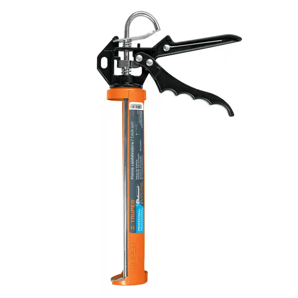 Pistola Calafatera Reforzada PICA-R. Cuerpo de acero y maneral de aluminio resistente a la corrosion. Gatillo reforzado y barril giratorio. Gancho curvo para colgar en estantes o escaleras. Aguja para destape
