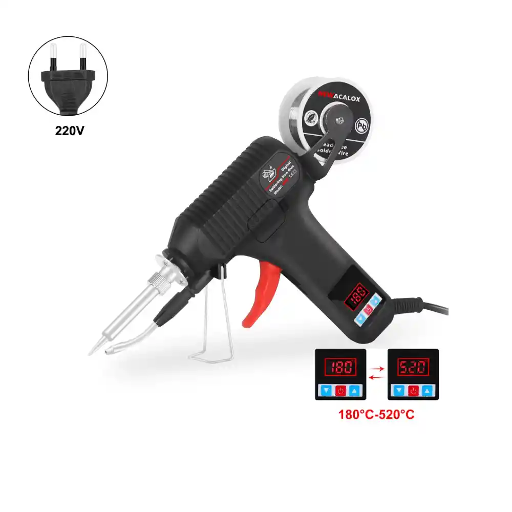 Especificación: Punta de aleación + plástico ABS resistente. Temperatura de trabajo: 180-520 grados Celsius Potencia: 80W Voltaje: 220 V, 50 HZ Clasificado con un diámetro de línea de estaño de 0,8-1,2 mm. Punta de soldador: serie 900M Tiempo de calentamiento: 2-4 minutos Característica: El calentamiento interno envía automáticamente una pistola de estaño para evitar quemaduras por altas temperaturas durante el funcionamiento. Cabezal de soldador serie 2, 900M, núcleo calefactor de material de mica natural, calentamiento rápido, duradero, de larga duración, reemplazable, ensamblado y desmontado. El diseño de la puerta lateral facilita la visualización de las operaciones internas y el reemplazo del núcleo calefactor.Diseño científico, ¡no es fácil quedarse atascado! se puede operar con una mano, verificar la situación del trabajo en cualquier momento, de manera eficiente y conveniente. Con interruptor de encendido, ahorro de energía y seguridad. Diseño de pantalla digital, temperatura 180-520℃ Unidad ajustable de ajuste de temperatura 5℃El andamio de alambre de estaño es desmontable y fácil de usar. Caja de plástico ABS de alta calidad, cómoda de sostener, el cable de alimentación es suave, curvo y más duradero. El paquete incluye: 1 pistola de estaño de soldadura con pantalla Digital (220V 80W UE) 1 cable de soldadura