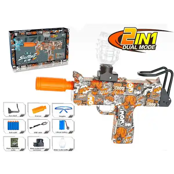 Experimenta la emoción de la batalla con nuestra pistola de balas de hidrogel y dardos de espuma! Equipada con bolas de gel y mini dardos tipo Nerf que se adhieren, incluye características como un silenciador, tapa plegable, depósito para cargar municiones, batería recargable 7.4VB con cargador USB y gafas de protección para una experiencia de juego segura y emocionante. Medidas: 34x23cm caja Pilas: carga USB