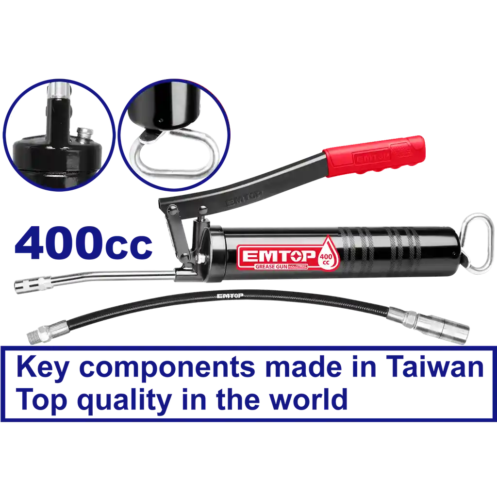 Pesados ??pistola de grasa Taiwán Calidad Capacidad: 400CC / 14oz Cargando manera: 14 oz Cartucho / a granel 400CC Presión de trabajo: 4500psi Presión de rotura: 10000psi Material: tubo de acero de 1,2 mm de aluminio +-Cast Accesorio estándar: 1pcs 12" de alta presión de la manguera flexible de nylon 1pcs metálica curva Boquilla Embalado por la caja de color