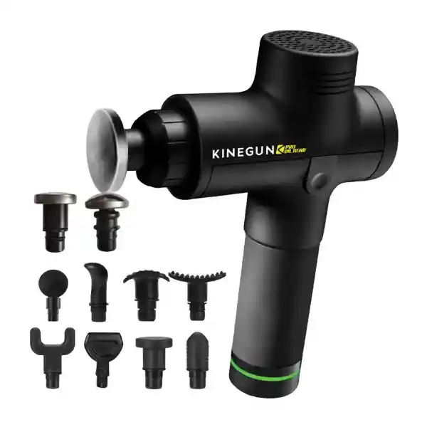 Pistola de masajes de 200W con 30 niveles, pantalla táctil y cabezales metálicos para aceites o cremas. Ideal para masajes profundos y personalizados. Incluye maletín
