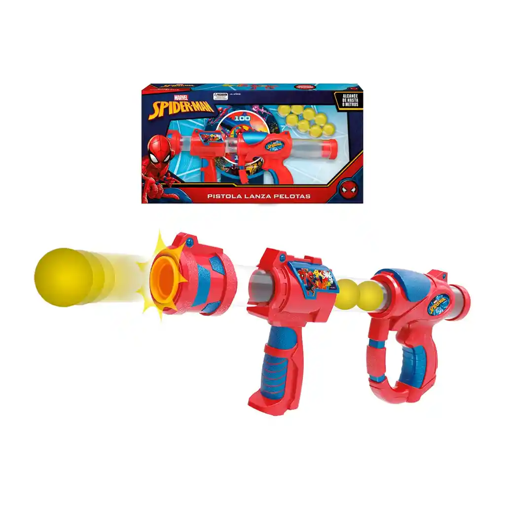 Con la nueva Pistola Lanza Pelotas Spiderman de Marvel, los más pequeños de la casa podrán convertirse en un superhéroe y defender la ciudad de los villanos que desean destruirla, ofreciéndole a los niños interminables horas de juego y diversión, demostrando su habilidad y puntería alcanzando a todos sus enemigos. Cuenta con un diseño arácnido teniendo una carga frontal haciendo que la inserción de pelotas sea un paso simple permitiéndoles lanzar 1 pelota a la vez, invitando a los niños a estar en total movimiento de una manera más entretenida e interactiva promoviendo un juego físico y social. Este lanzador viene con 8 coloridas pelotas, perfectas para horas y horas de juego de superhéroes al aire libre, además, este juguete es perfecto ya que contribuye en el desarrollo de la creatividad, potencia la puntería, destreza, la comprensión causa/efecto y la orientación espacial.