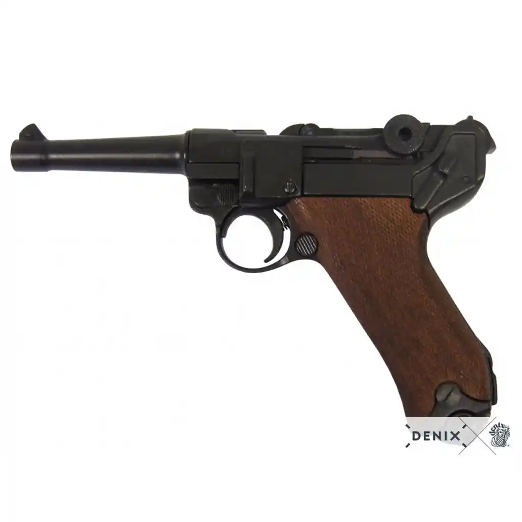 PISTOLA P08 3er REICH 1143 Reproduccion pistola parabellum P08 Marca Denix Modelo M-1143 Material Metal Zamak y madera Reproduccion para exhibición (no es producto de practica) Los mecanismo simulador de carga y disparo y cargador extraíble mantienen las características móviles del modelo original pero la reproduccion NO DISPARA Diseñada por Georg Luger en 1898 en Alemania Usado por soldados en las guerras del siglo XX Medida 25.5 centímetros Peso 980 gramos Fabricada en España La pistola Parabellum o modelo 1908 (P08), popularmente conocida como Luger, es una pistola semiautomática accionada por retroceso, que sobrevivió a las restricciones del Tratado de Versalles. Utiliza una corredera interna, operada mediante un brazo articulado, al contrario de la corredera externa común en casi todas las demás pistolas semiautomáticas. Fue diseñada por Georg Luger en 1898 y producida por la fábrica alemana de armas Deutsche Waffen und Munitionsfabriken (DWM) a partir del año 1900.Durante sus años de vida útil la Luger P08 pasó por las manos de varios fabricantes, quienes se encargaron de producir más de un millón de unidades de esta mítica pistola que marcó un antes y un después en la historia de las armas cortas. Aunque los primeros modelos fueron fabricados en calibre 7.65×21 Parabellum, su modelo de 1908, es famoso por ser la pistola para la cual se desarrolló el cartucho 9×19 Parabellum. La denominación Parabellum proviene de un antiguo dicho latino “Su vis pacem, para bellum” (“Si quieres paz, prepárate para la guerra”). La pistola Parabellum Luger se hizo muy popular gracias a su empleo por parte de Alemania durante la Primera y Segunda Guerra Mundial y fue una pistola muy codiciada por los soldados durante todo el siglo XX.