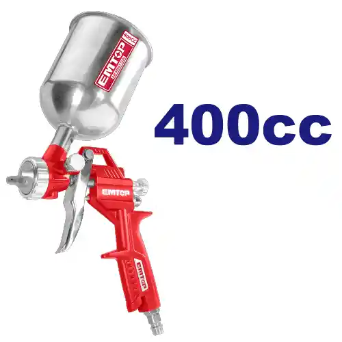 Boquilla estándar: 1,5 mm Ancho del patrón: 180-250 mm Capacidad de pintura: 400 cc Adecuado para capa base Con conector tipo Europa, conector tipo USA, conector tipo Nitto y conector tipo Italia. Boquilla opcional: 1,2-1,8 mm Presión de funcionamiento: 3-4 bar Contras de aire: 4.2-7.1cfm (119-200l / min)
