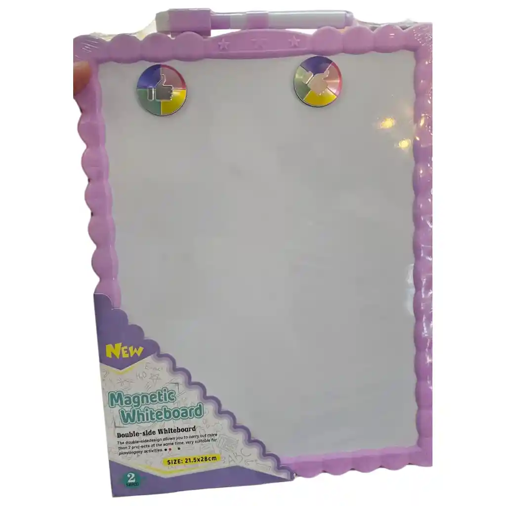 Optimiza tu espacio de trabajo o estudio con esta pizarra magnética versátil de tamaño mediano. Su diseño de dos caras permite una gestión integral de tareas. Especificaciones técnicas: Dimensiones: 21.5 x 28 cm. Cara A: Calendario/Planificador semanal impreso. Cara B: Superficie blanca lisa para escritura libre. Accesorios incluidos: 1 marcador negro para pizarra y 2 imanes potentes. Uso: Ideal para oficinas, refrigeradores o dormitorios. Opción 3: Formato de "Beneficios" (Corta y al grano) ¡Organización 2 en 1! 📋 Lleva el control de tus tareas con nuestra pizarra magnética cuadrada. ¿Qué incluye? Pizarra de 21.5x28 cm, 2 imanes y 1 plumón. ¿Por qué te encantará? Es reversible. Usa el lado de planificador para tus compromisos fijos y el lado blanco para listas de compras, dibujos o notas flash. Versatilidad: Al ser magnética, puedes pegar tickets, fotos o facturas sin perder nada de vista.
