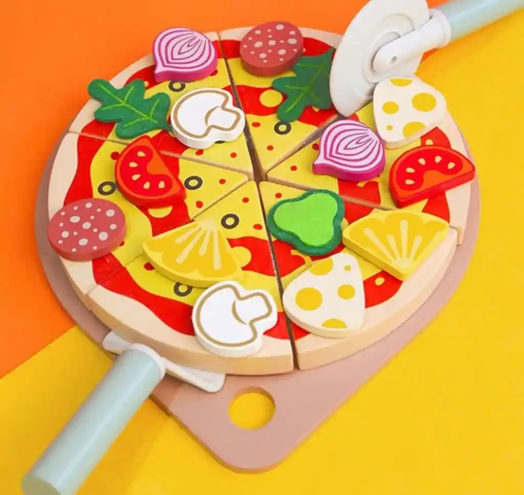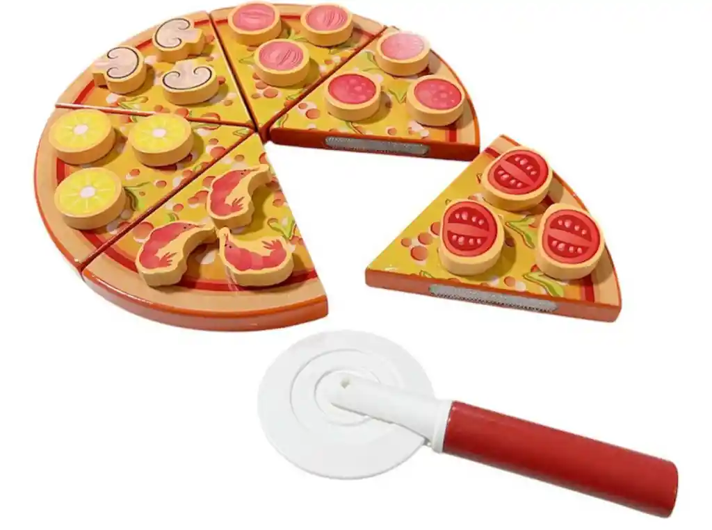Juguete de madera Pizza Didáctico Arma tu pizza con los ingredientes y cortala en porciones incluye dos utensilios y un plato Medidas: 21cm de diámetro Envíos a todo Chile