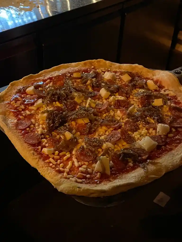 Base salsa de tomate y queso mozzarella, chorizo zarta y cebolla caramelizada