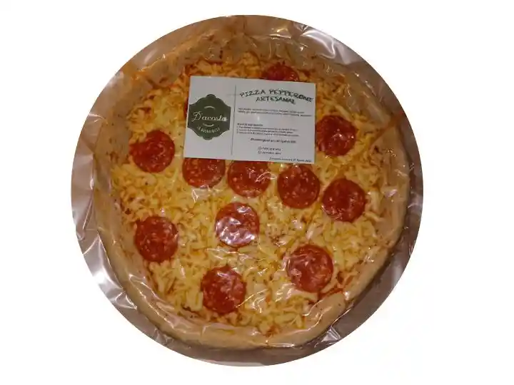 Exquisita pizza artesanal (8 porciones) envasada al vacio, base de salsa de tomate artesanal, quesso mozarella y pepperoni. Tiene una duración de 2 semanas regriferada.
