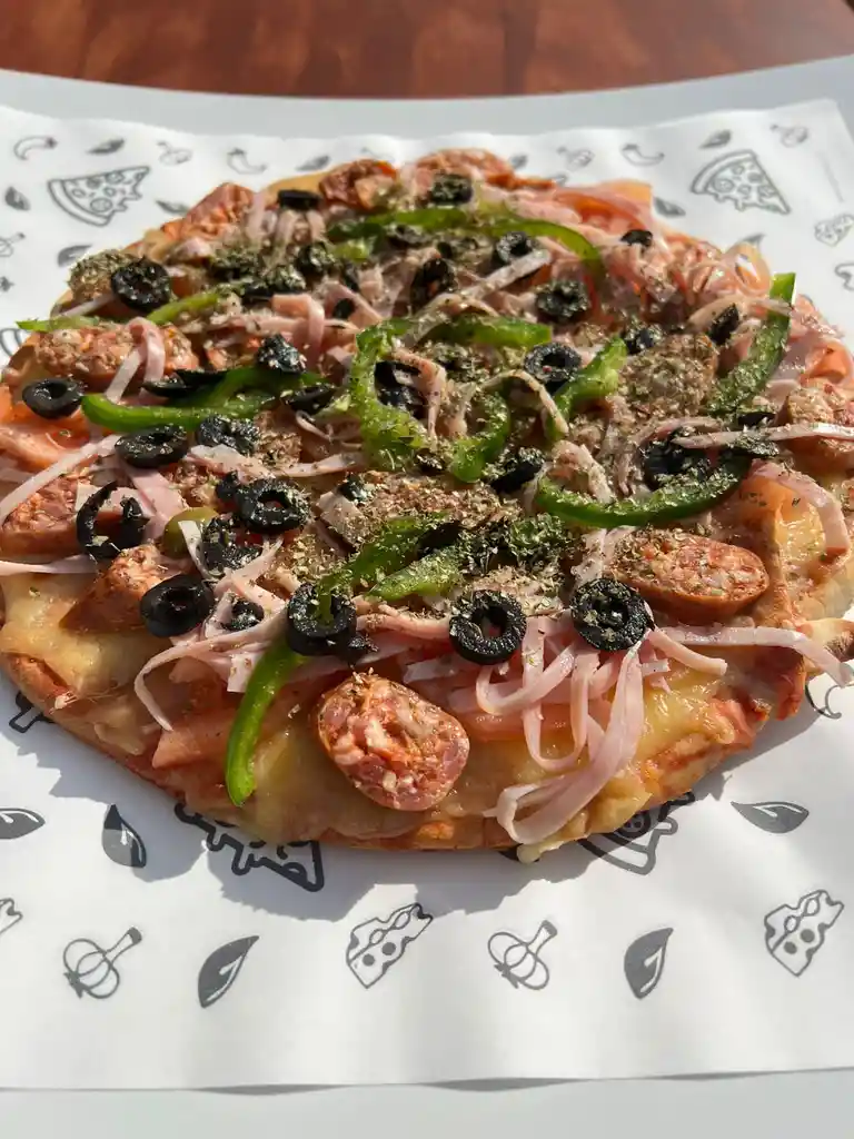 LA ESPAÑOLA ES UNA PIZZA DE CARÁCTER, QUE UNE EL DULZOR DEL JAMÓN ACARAMELADO Y EL SABOR ESPECIADO DE LA LONGANIZA. LA MOZZARELLA CREMOSA SE COMBINA CON ACEITUNAS, TOMATE Y PIMENTÓN, MIENTRAS EL ORÉGANO APORTA UN AROMA TRADICIONAL. IDEAL PARA AMANTES DE SABORES INTENSOS Y AUTÉNTICOS.
