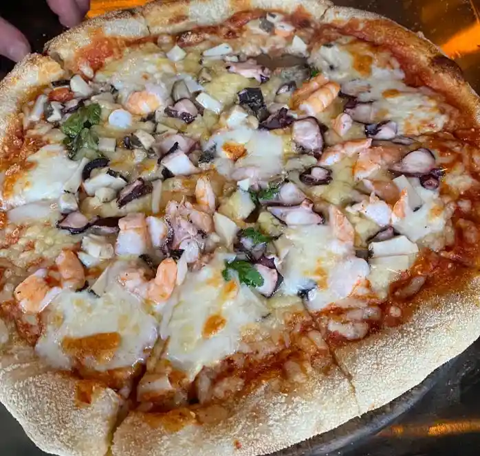 Base salsa de tomate y queso mozzarella, camarón, loco, pulpo, un toque de cilantro y dos media lunas de limon para agregar al gusto