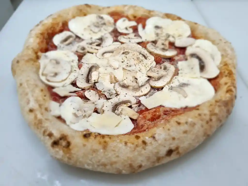 Masa con proceso de fermentación de 48 horas en frío, Salsa pomodoro San Marzano DOP, mozzarella fior di latte, champiñones, toque de trufa y queso grana padano. Congelada.