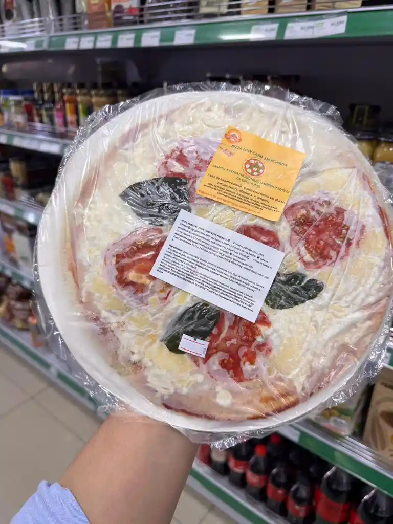 Margarita: Queso mozzarella, tomate, harina de almendras, coco, pure de tomate natural, cascara de psyllium en polvo, ajo, oregano, sal del himalaya, levadura seca, bicarbonato de sodio, albahaca, laurel.
