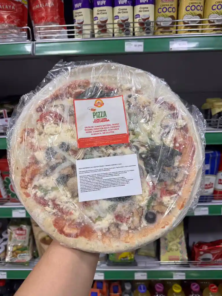 Vegetariana: Queso mozzarella, tomate, harina de almendras, coco, puré de tomate natural, cascara de psyllium en polvo, ajo, orégano, sal del himalaya, champiñones, aceitunas, pimentón, albahaca, cebolla y salsa de tomate.