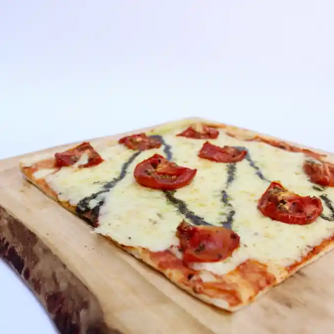 Deliciosos tomates asados, orégano, pesto de albahaca, queso mozzarella y salsa pomodoro. Cómo calentar: Pre- calentar el horno a 250º - 5 minutos antes Sacar el producto del envase plástico Introducir pizza congelada al horno por 12 – 15 minutos a 250º. Importante: calentar en la bandeja de lata para obtener una mejor crocancia.