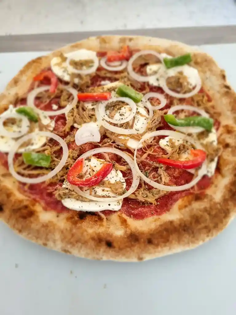 Masa con proceso de fermentación de 48 horas en frío, salsa pomodoro San Marzano DOP, mozzarella fior di latte, carne mechada, cebolla, pimiento rojo, pimiento verde, toque de orégano y pimienta. Congelada.