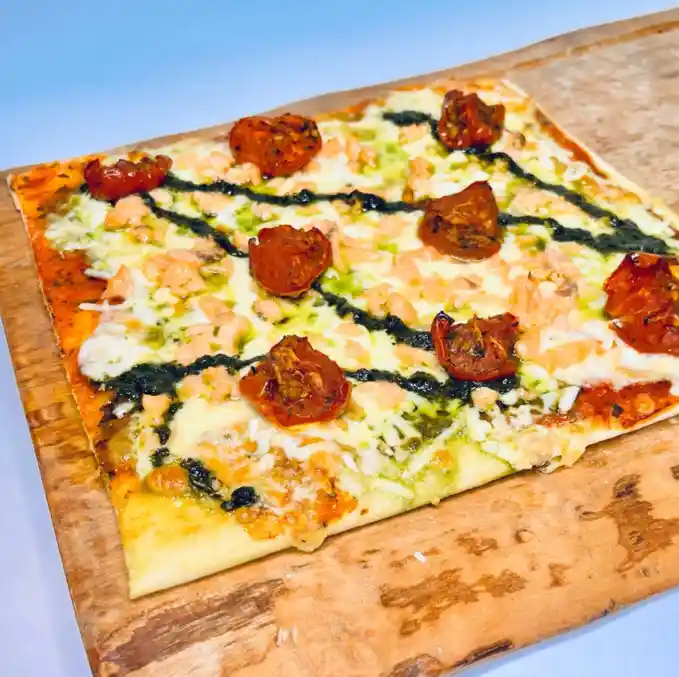 Deliciosa pizza de salmón ahumado, tomates asados, pesto de albahaca, queso de cabra, queso mozzarella y salsa pomodoro. Cómo calentar: Pre- calentar el horno a 250º - 5 minutos antes Sacar el producto del envase plástico Introducir pizza congelada al horno por 12 – 15 minutos a 250º Importante: calentar en la bandeja de lata para obtener una mejor crocancia.