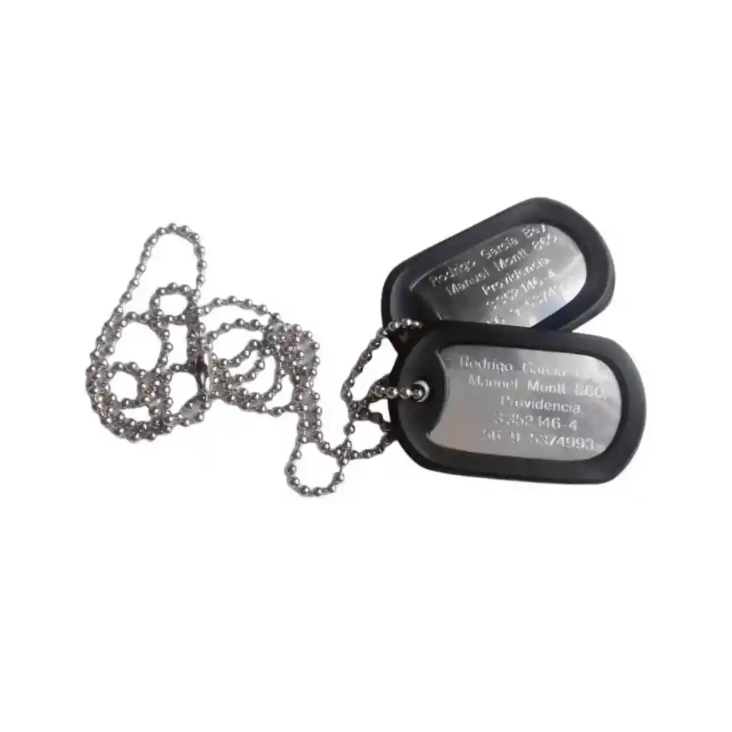 Características principales Marca PIM Modelo PLACA DE IDENTIFICACION Material Acero Diámetro 3 mm Largo x Altura 5 mm x 1 mm Otras características Estilos: militar, placa, identificación Tipo de piedra: acero 2 placas PIM Metal de acero quirúrgico y goma silenciador $ 6.990