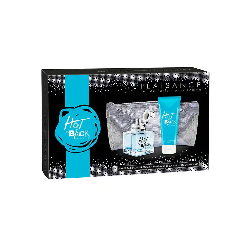Plaisance: Estuche Fragancia Hot In Black, Crema Cuerpo Y Cosmetiquero
