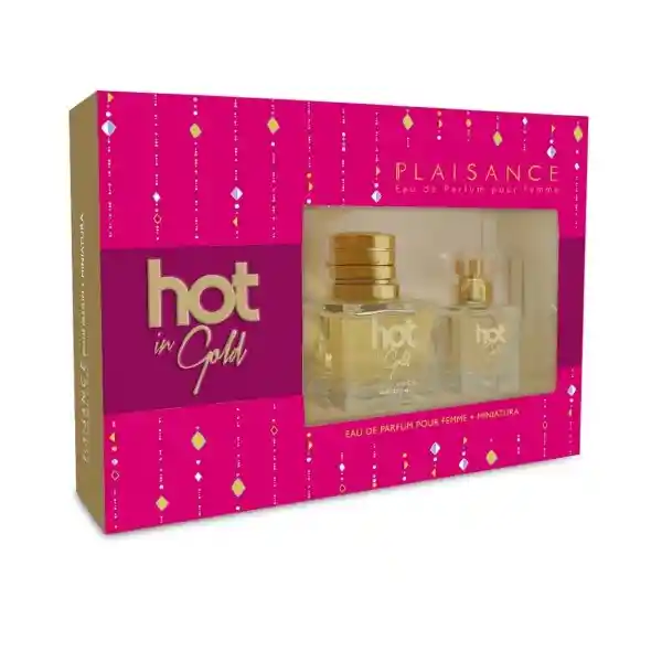Kit Plaisance Contiene 2 Unidades. Perfume Hot in Gold 100 mL + Miniatura Plaisance 1 Und. Fragancia Pensada Para Una Mujer Atractiva y Sensual Que le Gustan Los Aromas Intensos Sorprendentes y Únicos.