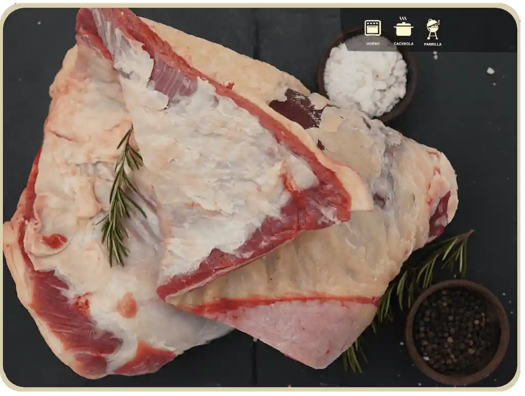 De forma aplanada, medianamente gruesa y en su cara externa posee una extraordinaria cubierta de grasa, lo que ayuda a conservar sus jugos y tener un sabor especial y particular. Ideal para la parrilla con sistema de coccion al spiedo y olla.
