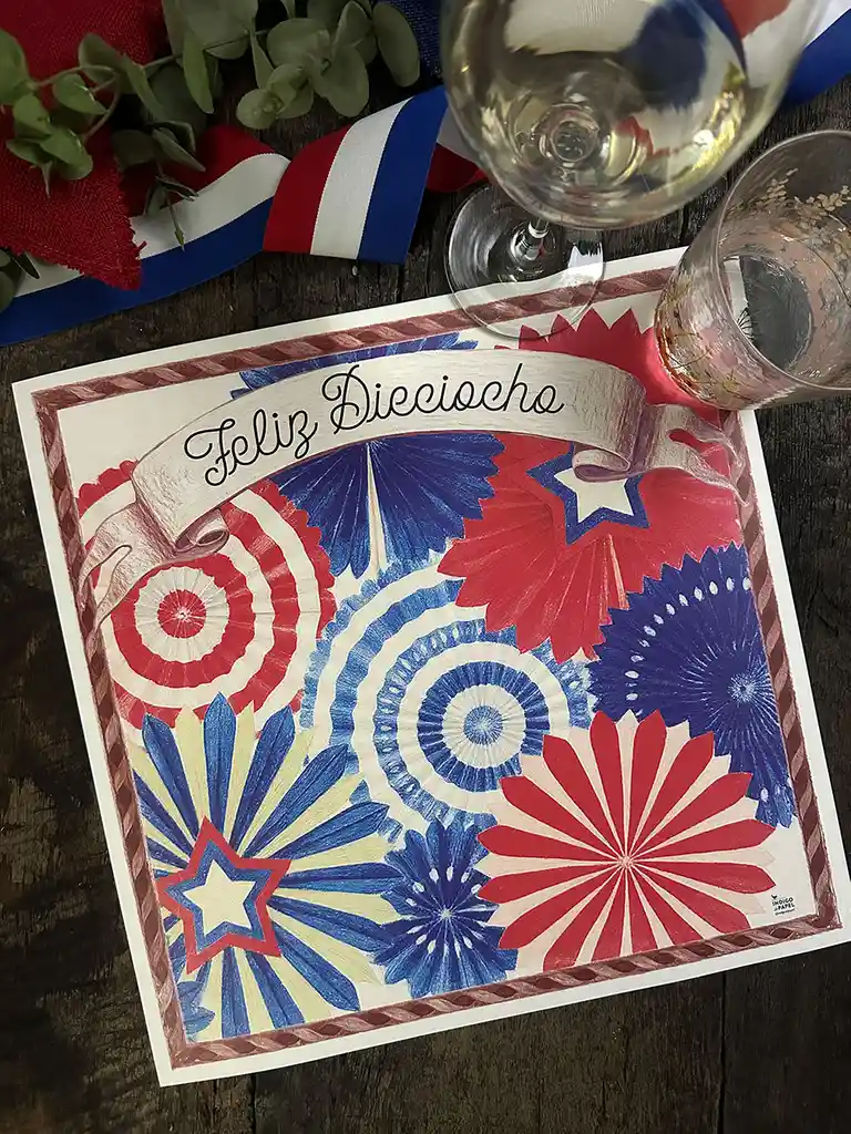 Set de 12 individuales de papel Tamaño 32,5 x 32,5 cm. Papel blanco (sin brillo) de 120 g. Diseñado y fabricado en Chile.