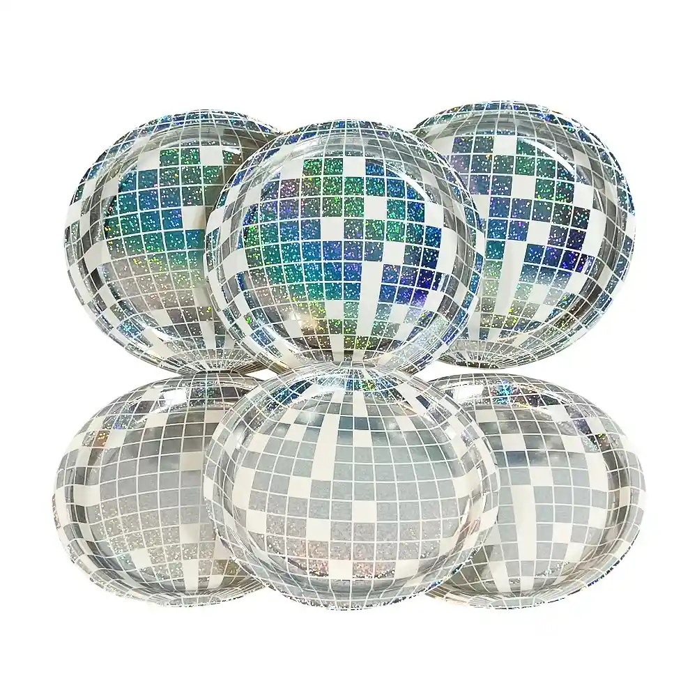 📋 Detalles técnicos Tipo de producto: Platos desechables de cartón Diámetro: 18 cm aprox. Diseño: Disco holográfico Cantidad: 6 unidades por paquete Uso recomendado: Servir torta, snacks y postres en fiestas y celebraciones