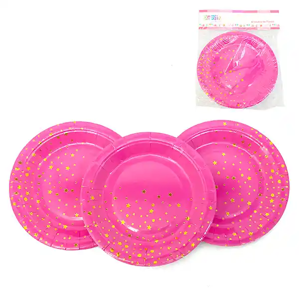 ¡Disfruta de la practicidad y versatilidad de nuestros platos ecologicos hechos de carton! El Plato Carton estrellas y circulos rosado de 18 cm es resistente y perfecto para cualquier ocasion. Contiene 6 unidades.