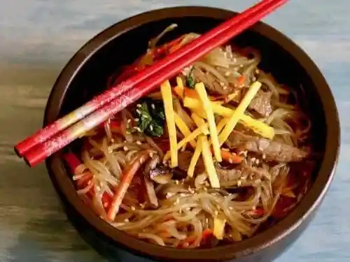 Fideos de Camote, carne de vacuno, champiñon, semillas de sesamo, zanahoria, acelga, cebollin, cebolla y ajo (peso 270grs aprox.)