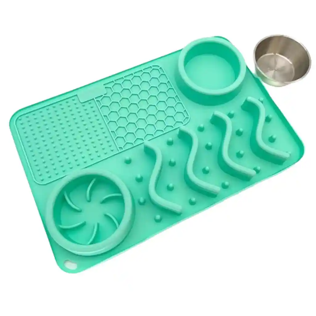 Tapete de silicona con diseño simple y elegante, que divide la comida en múltiples minicomidas, esparciédola en pequeños bolsillos, que permitirán que tu mascota aprenda a comer despacio. Contiene además un espacio, para colocar un pequeño recipiente de agua. Beneficios para la salud: La alfombrilla para perros de alimentación lenta, ayuda a reducir la ansiedad en las mascotas al proporcionar una actividad calmante durante la hora de comer. El acto de lamer la alfombra puede liberar endorfinas en el cerebro, lo que puede tener un efecto relajante en los perros y reducir los sentimientos de ansiedad o estrés. Promueve una alimentación más lenta, lo que permite a los perros masticar su comida adecuadamente y reducir el riesgo de asfixia y problemas digestivos como indigestión, hinchazón y malestar. Por qué necesitas? La alfombrilla es antideslizante, asegurando que se mantenga en su lugar durante la comida y evita derrames o desorden. Pequeñas ventosas en la parte inferior de la alfombrilla que se pueden pegar en cualquier superficie lisa como azulejos, vidrio, azulejos de baño, mostradores y madera. Distracción perfecta para tu mascota durante la ducha o el aseo, por lo que es más fácil para los dueños de mascotas mantener a sus amigos peludos tranquilos y cooperativos. Material de silicona de alta calidad que no es tóxico y material de silicona de grado alimenticio. Dimensiones: 30x21 cm Color: Turquesa Apto para mascotas de todos los tamaños.