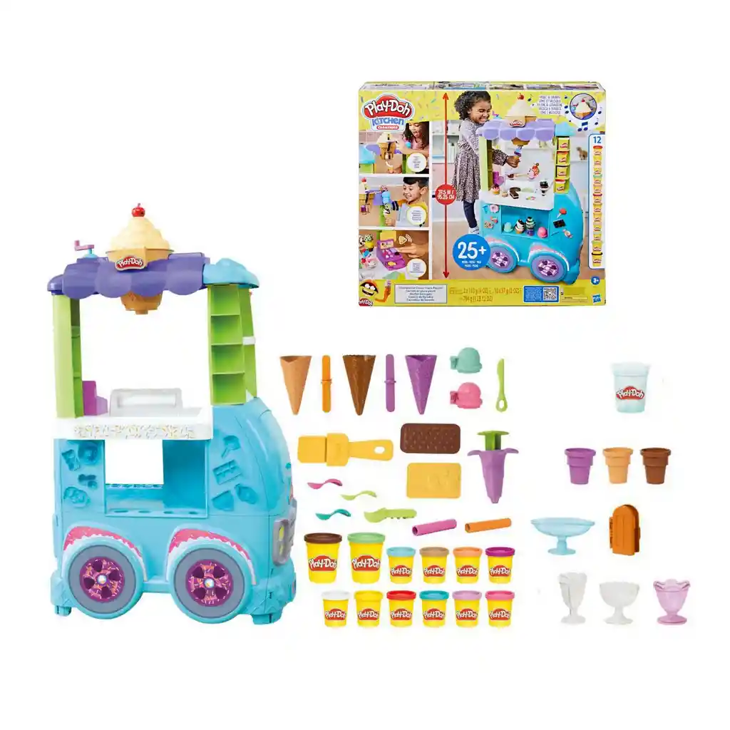 El camión de helados kitchen creations de Play-Doh convertirá las tardes de los más pequeños en horas de juegos lleno de entretención y diversión. Este set de cocina es perfecto para que los niños echen a volar su imaginación, ya que les permite crear muchas golosinas de juguete con las 27 herramientas y la máquina de helados, y personalizarlas con las herramientas, moldes de caramelos y chispas Play-Doh para después, venderlas con la caja registradora. La música y los divertidos sonidos de la caja registradora les harán imaginar que tienen su propio negocio de helados. Son 12 botes de plastilina Play-Doh que les brindan todos los colores que necesitan para empezar. Este juguete fomenta de una manera divertida la creatividad y la imaginación, mientras aprenden a conocer los fundamentos de la comunicación y la cooperación, la confianza, la amistad y el desarrollo lingüístico.