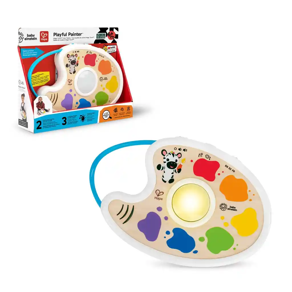 Este juguete de inspiración Montessori ofrece 2 modos de exploración del color sin ensuciar y recompensa la curiosidad del bebé con luces, música y mucho más. En el modo Descubrimiento del color, pulsa cada mancha de pintura para descubrir 6 nombres de colores primarios y secundarios en 3 idiomas. Seleccione el modo Mezcla de colores para un juego interactivo, ya que el bebé relaciona cada nombre de color con atractivas secuencias de luces y melodías. Ambos modos introducen importantes habilidades de desarrollo, como la causa y el efecto, a la vez que fomentan el compromiso sensorial y el descubrimiento del lenguaje. La tecnología Magic Touch responde a cada toque y el control de volumen protege los oídos de los más pequeños. También incluye los vídeos de Zen, la cebra de Baby Einstein, y un elegante diseño de madera que se limpia fácilmente. Destinado a artistas a partir de 6 meses. Requiere 2 pilas AAA.