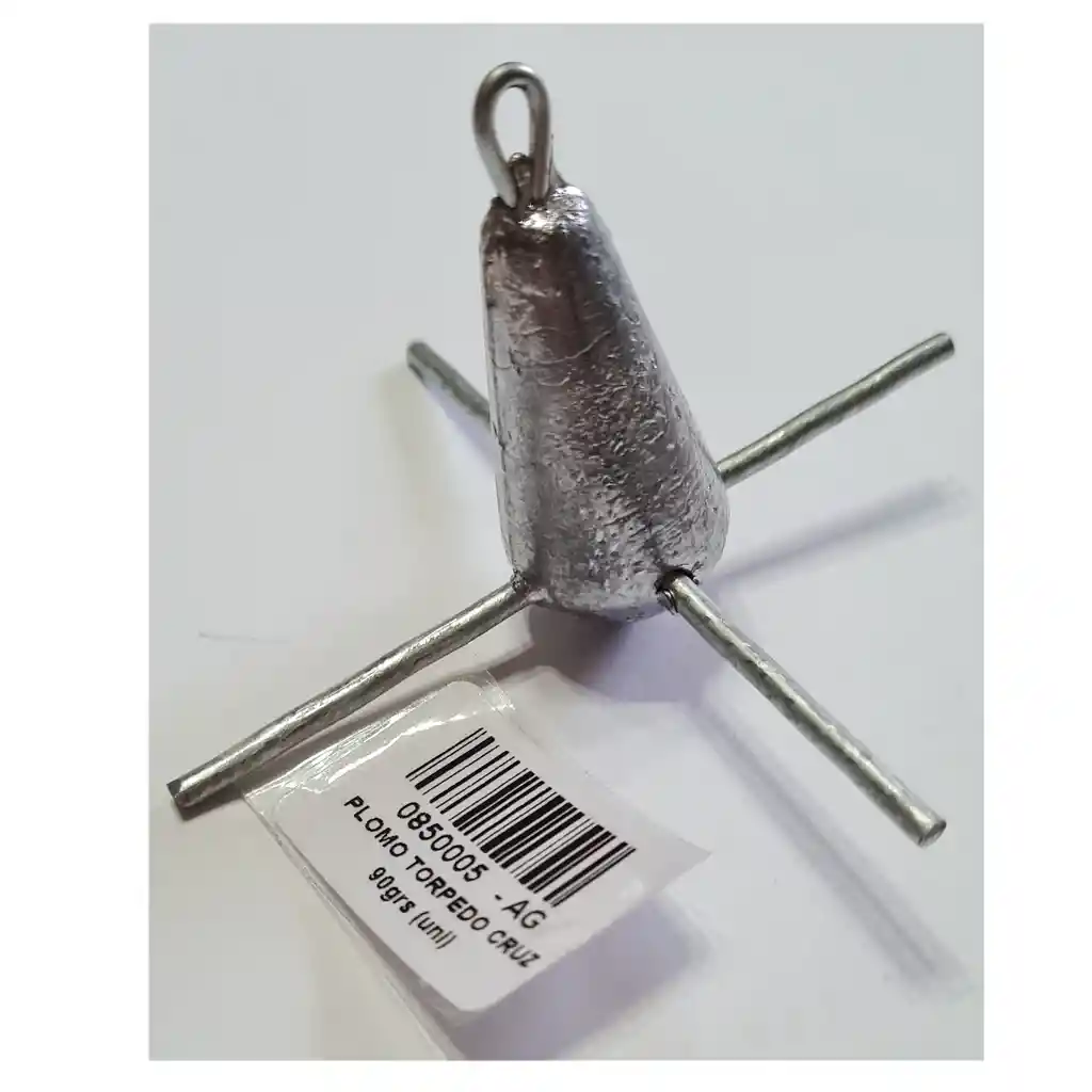 PLOMO TORPEDO CRUZ 90grs (uni) Marca Silver Wave Modelo torpedo cruz Plomo con puntas en cruz Para fondo de mar arenoso Se clava y tensa la línea Color Plateado Peso 90 gramos (+/- 5 gramos) Tamaño alto 5 cms ancho 9 cms (ancho del plomo 2 cms) Grosor de los lambres cruz 2 mm Con ojetillo de alambre Material Plomo con alambres Fabricado en CHILE Venta por unidad Uso ideal en suelo arenoso logrando buena tension del nylon Precausion: no usar el suelo rocoso