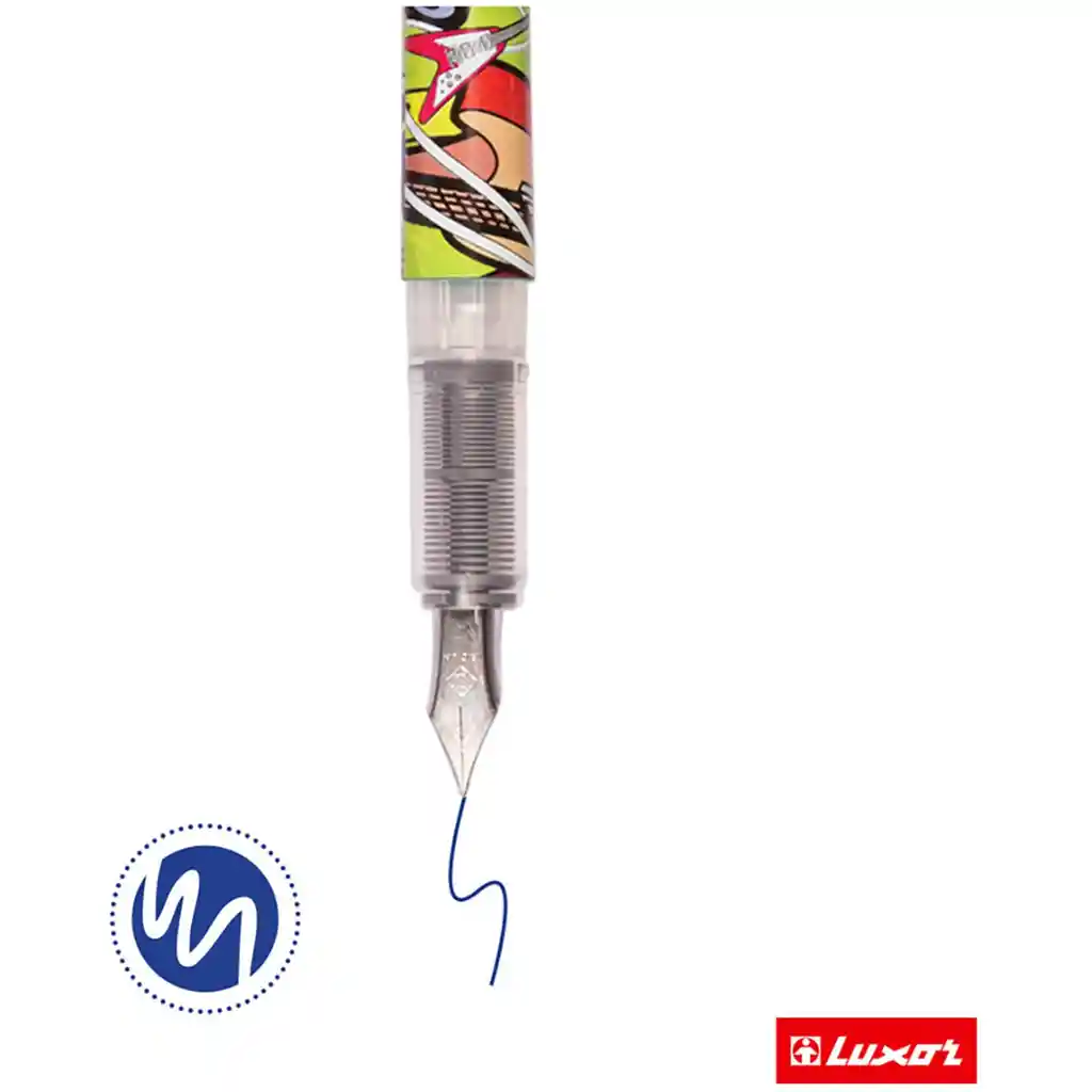 Pluma estilográfica Luxor Ink Glide con cuerpo de colores brillantes y punta de iridio. La pluma estilográfica tiene un grosor de línea de escritura de 0,8 mm. El bolígrafo azul es ideal para trabajar y firmar documentos importantes. El mango tiene un diseño vibrante con colores mezclados. El cuerpo de plástico liviano es cómodo de sostener en la mano. Diseños de estuches variados.