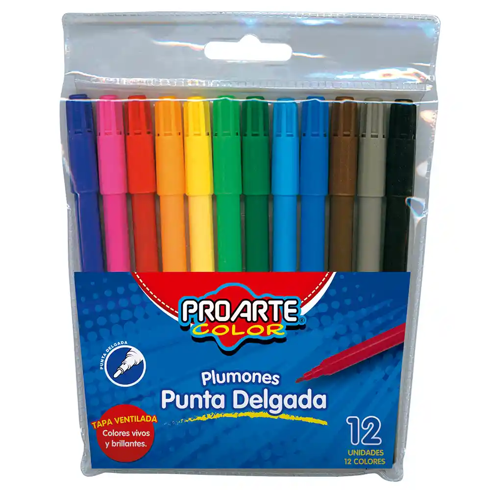 Set de 12 plumones de punta fina, ideales para escribir, dibujar y detallar tus proyectos escolares o creativos. Colores vibrantes y de secado rápido que permiten trazos precisos y limpios.