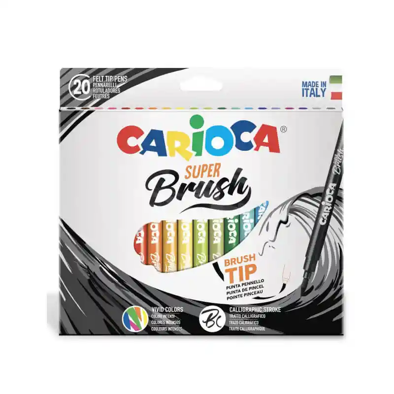 Inicio / Escolar / PLUMONES SUPER BRUSH 20 COLORES PLUMONES SUPER BRUSH 20 COLORES Categoría: Escolar Descripción PLUMONES SUPER BRUSH 20 COLORES Punta pincel, suave y flexible. Ideal para diseños caligráficos. Tinta de larga duración, lavable y no tóxica. Capuchón ventilado anti-asfixia. Medidas plumón: Ø 1 cm, largo 16,5 cm.