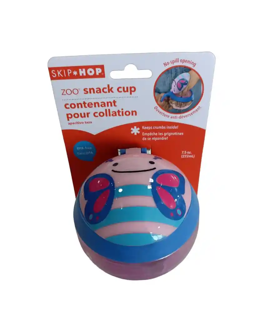 Pocillo Snack Cup Zoo Mariposa, perfecto para llevar snack, esté lindo pocillo fomenta la merienda independiente sin el desorden. El mango de fácil agarre tiene el tamaño adecuado para las manos pequeñas, y la tapa superior a presión asegura que la comida se mantenga fresca. La abertura interior flexible evita que los bocadillos se derramen, incluso si se vuelca. ¡Con dos tapas hay menos desorden y la bolsa de mamá se mantiene sin migas! Características: Edad recomendada 12 meses +. La tapa superior a presión mantiene los refrigerios frescos. Asa de fácil agarre / antideslizante. Cuerpo claro para ver cuándo se necesita rellenar. Orificio en el mango para atar en el coche. Sin BPA, sin PVC y sin fosfatos. Capacidad: 222 ml.