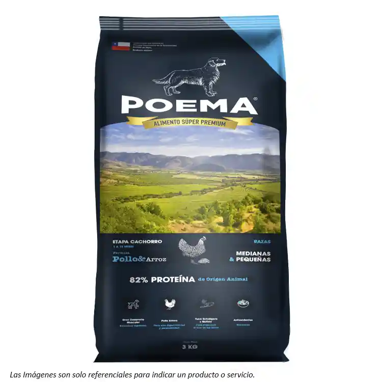 Poema es un Alimento Súper Premium Chileno para Perros Cachorros de razas Pequeñas y/o Medianas hasta los 12 meses de edad. Una de sus principales caracteristicas es el Hidrolizado de Pollo (proteina proveniente desde la zona central del país), que contribuye de manera importante en la nutrición de su mascota ya que se digiere de mejor manera, asegurando una alta digestibilidad y una excelente palatabilidad. Adicionalmente se incorpora Arroz, un cereal saludable (no alergeno) para la digestión. Todos sus ingredientes han sido cuidadosamente seleccionados para lograr una fórmula balanceada, otorgando músculos sanos, huesos fuertes, pelaje brillante y un aliento sano. Ingredientes: Hidrolizado de pollo, harina de subproductos de pollo, harina de arroz, hidrolizado de salmón, avena, aceite estabilizado de pollo, almidón de mandioca, saccharomyces cerevisie (fuente de fructo-oligosacáridos y manano-oligosacáridos), salvado de arroz, aceite de salmón y de sardinas, linaza, cloruro de potasio, cloruro de sodio, vitamina A, vitamina D, vitamina E, vitamina K, tiamina, riboflavina, ácido pantoténico, niacina, vitamina B6, biotina, ácido fólico, vitamina B12, cloruro de colina, hierro, sulfato de manganeso, cobre, cobalto, zinc, yodo, selenio, cloruro de colina, extracto de yuca schidigera y quillay, vitamina C, saborizante natural, extracto de romero y tocoferoles mixtos.