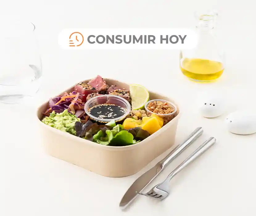Poke en base a quinoa tricolor, Tataki de atún envuelto en mix de sésamo, hojas verdes, mango, guacamole, mix de repollo morado - zanahoria, cebolla crispy y salsa teriyaki