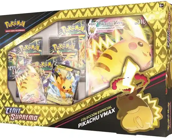 Gigantes Max ¡Tu Juego Con Pikachu Vmax! ¡Prepárate Para Una Tormenta Eléctrica de Proporciones Gigantes Max en Esta Colección Especial Que Incluye Paquetes de Refuerzo y Más de la Expansión Pokémon Tcg: Crown Zenith! Apareciendo Como Una Carta Promocional en Dos Tamaños Pikachu Vmax Genera Energía Con Tail Charge Luego Suelta un Enorme Ataque G-Max Thunder. También Encontrarás Pikachu V Para Que Puedas Poner en Juego Rápidamente a Pikachu Vmax. Pon la Potencia al Máximo Voltaje ¡Pikachu Vmax Quiere Pelear!Pokémon Tcg: Colección Especial Cenit Supremo Pikachu Vmax Español Incluye: 1 Tarjeta Promocional de Lámina Grabada Con Pikachu Vmax1 Carta Promocional Foil Con Pikachu V1 Tarjeta Promocional de Gran Tamaño Con Pikachu Vmax5 Paquetes de Refuerzo de Pokémon Tcg: Crown Zenith Una Tarjeta de Código Para Pokémon Tcg Live.