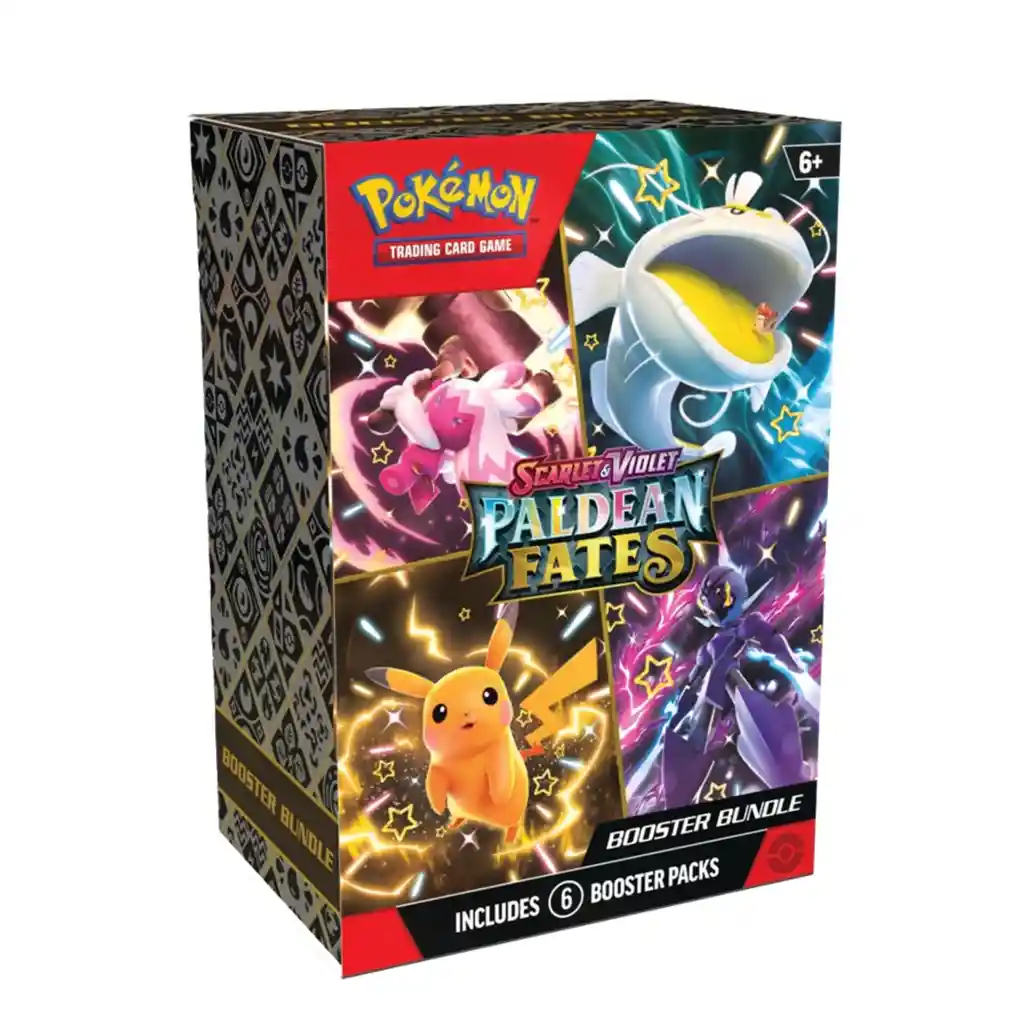Brilla junto a los Pokemon de Paldea! El foco de atencion resplandece con los Pokemon Shiny que regresan a Pokemon TCG! Pikachu Shiny ilumina el camino como Tinkaton, Ceruledge, Dondozo y mas de 100 Pokemon Shiny lo siguen. Mientras tanto, Great Tusk e Iron Treads aparecen como Pokemon ex del pasado y del futuro, y Charizard, Forretress y Espathra muestran sus habilidades unicas como Pokemon Tera Shiny ex. Arroja algo de luz y descubre maravillas brillantes en la expansion Scarlet amp; Violetmdash;Paldean Fates! Contenido: <li>6 sobres booster de Pokemon TCG Scarlet amp; Violet ndash; Paldean Fates. <li>10 cartas + 1 codigo para Pokemon TCG Live en cada sobre.</li> </ul> </li> </ul>