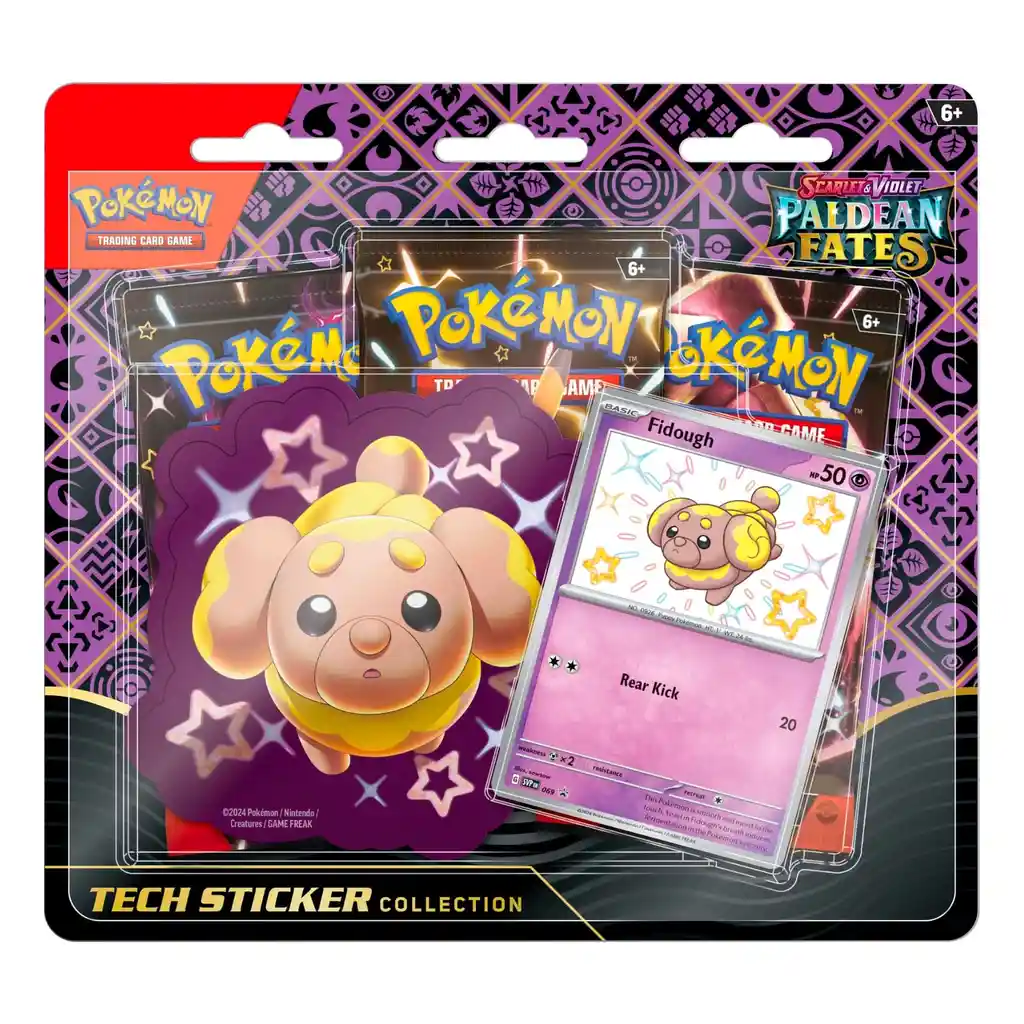 ¡Dale un toque especial a tu tablet, laptop u otro dispositivo tecnológico con un fiel y amigable compañero Pokémon Shiny de la región de Paldea!Dentro de esta caja, encontrarás una genial pegatina tecnológica y una carta promocional con uno de tres Pokémon Shiny, además de sobres de refuerzo de la exclusiva expansión de Scarlet Violet- Paldean Fates.Contenido:1 carta promo de Fidough Shiny.1 sticker de Fidough Shiny.3 sobres de la expansión Paldea Fates.1 código para jugar Pokemon TCG online