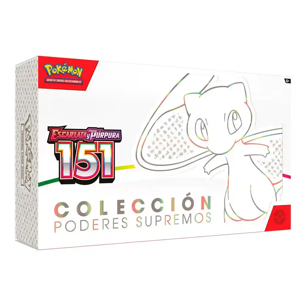 La colección Poderes Supremos de Escarlata y Púrpura-151 de JCC Pokémon contiene:• 1 carta holográfica de promoción grabada en relieve de Mew ex• 1 carta holográfica de promoción con ilustración expandida de Mewtwo• 1 carta metálica grabada en relieve de Mew ex• 1 tapete• 1 caja para cartas• 1 moneda de Mew• 6 dados a modo de contadores de daño• 2 marcadores de condición de plástico• 16 paquetes de mejora de Escarlata y Púrpura-151 de JCC Pokémon• 1 carta con código para JCC Pokémon Live"
