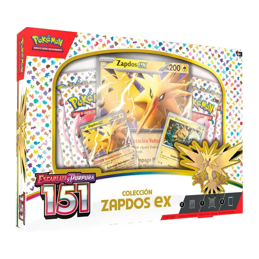 La colección Zapdos ex de Escarlata y Púrpura - 151 de JCC Pokémon contiene: • 1 Carta holográfica promocioanl de Zapdos ex• 1 Carta hologáfica de Electabuzz• 1 Carta hologáfica de gran tamaño de Zapdos ex • 4 paquetes de mejora de Escarlata y Púrpura - 151 de JCC Pokémon • 1 carta con código para el Juego de Cartas Coleccionables Pokémon Live "