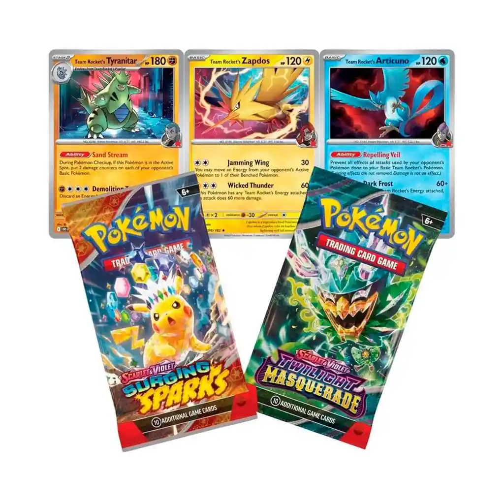 Amplía tu colección con tres cartas holográficas de JCC Pokémon de Articuno, Zapdos y Tyranitar del Team Rocket, además de una moneda metálica y dos paquetes de mejora de JCC Pokémon.